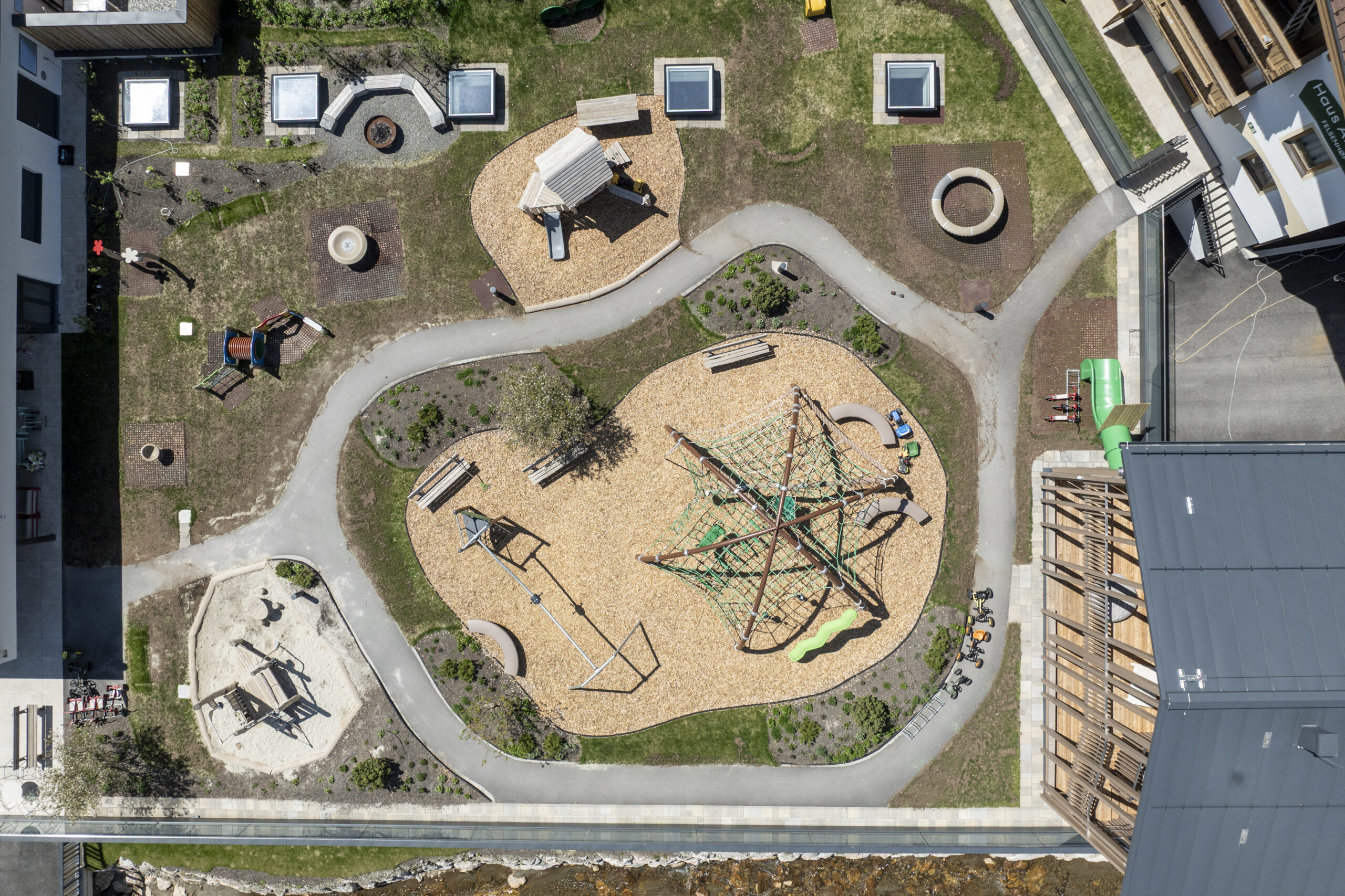 Besonderer Fokus lag hier auf der Konstruktion über der Tiefgarage – tragfähige Deckenabdichtung, Dachflächendämmung sowie sichere Fassadenabschlüsse und kleinflächige Aufbauten für Spielgeräte.