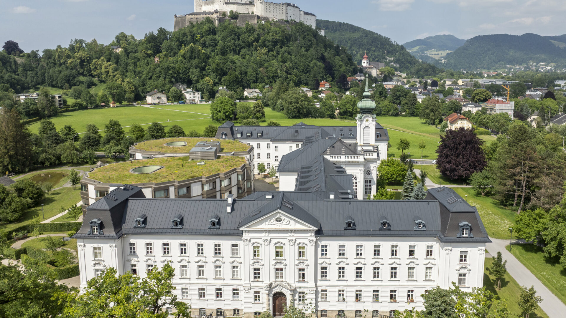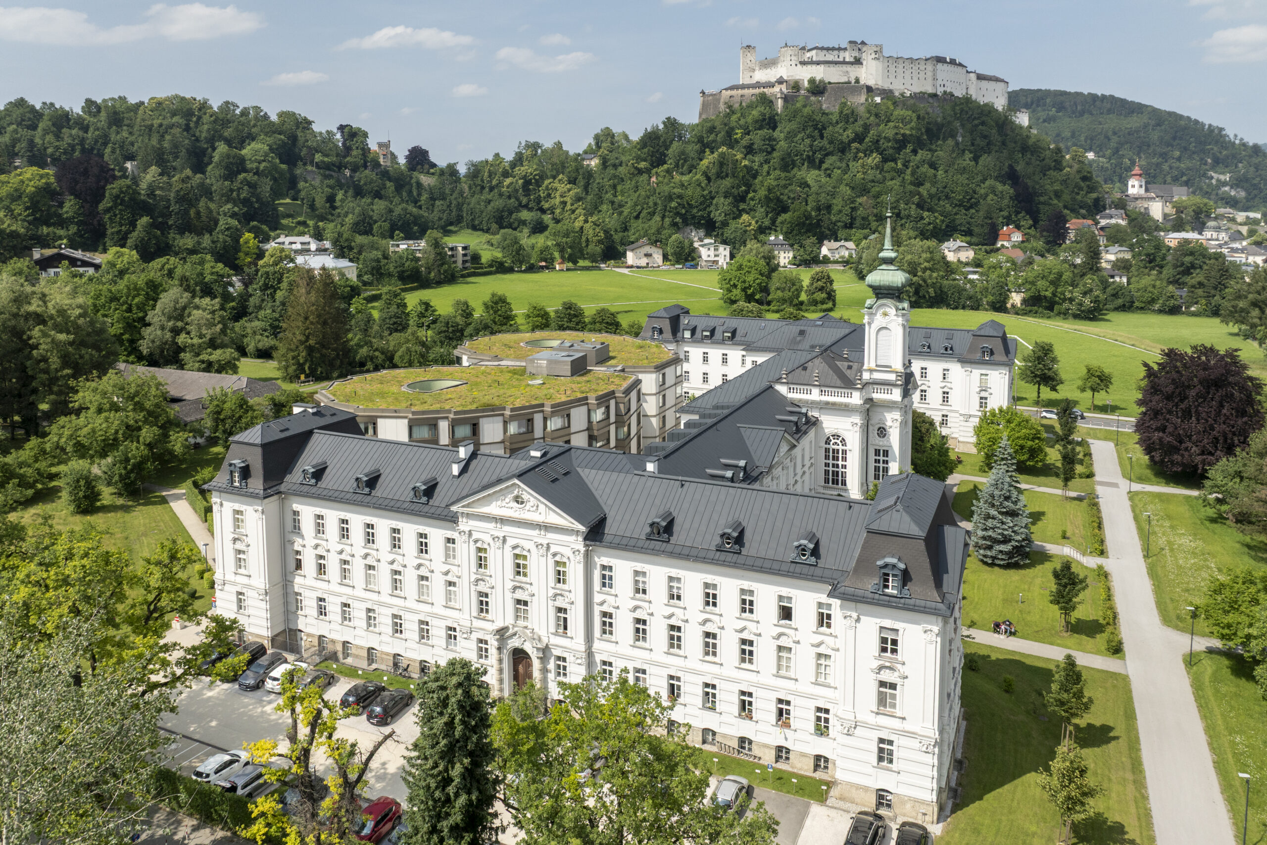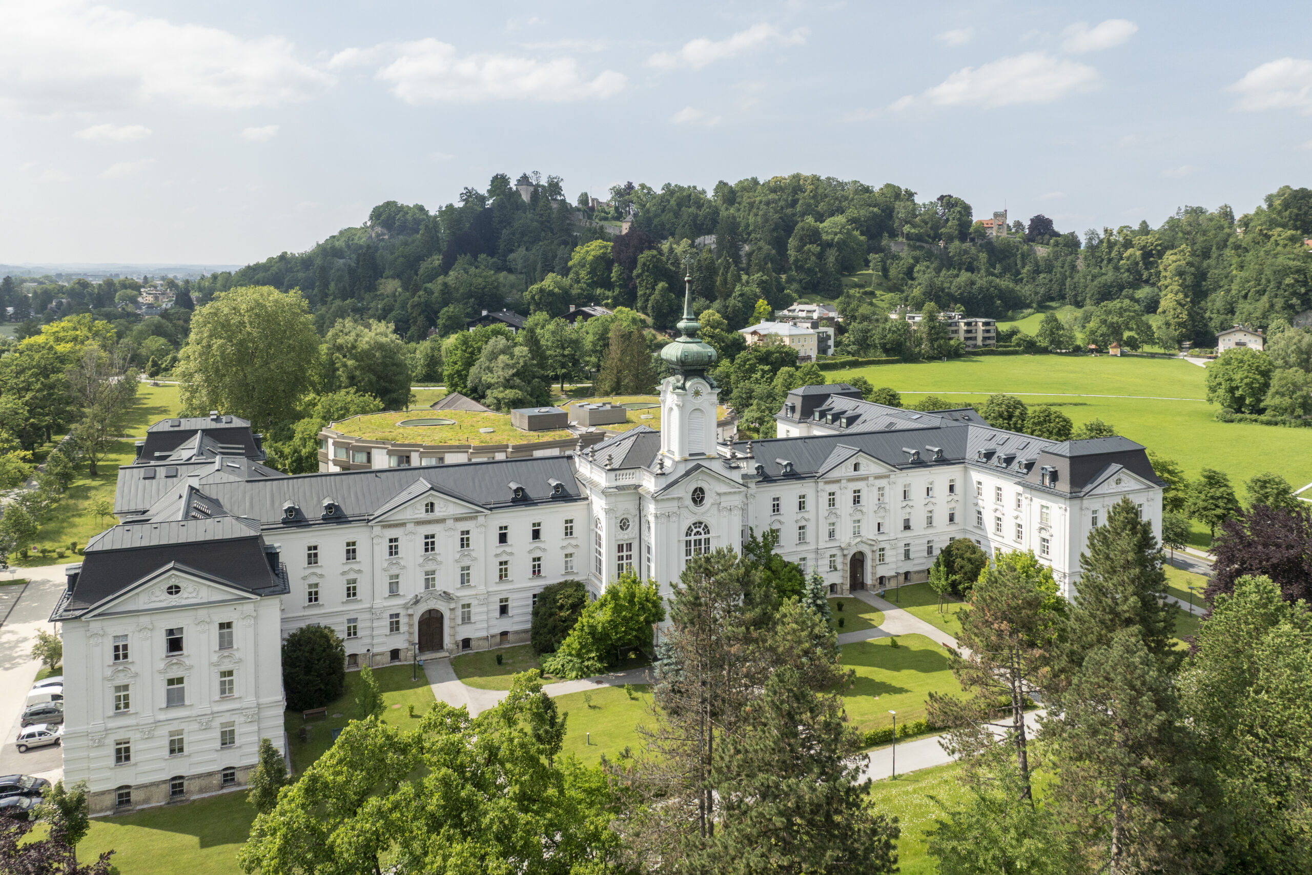 Das neobarocke Ensemble steht sowohl unter Denkmalschutz als auch im Landschaftsschutzgebiet Nonntal.